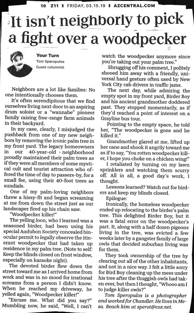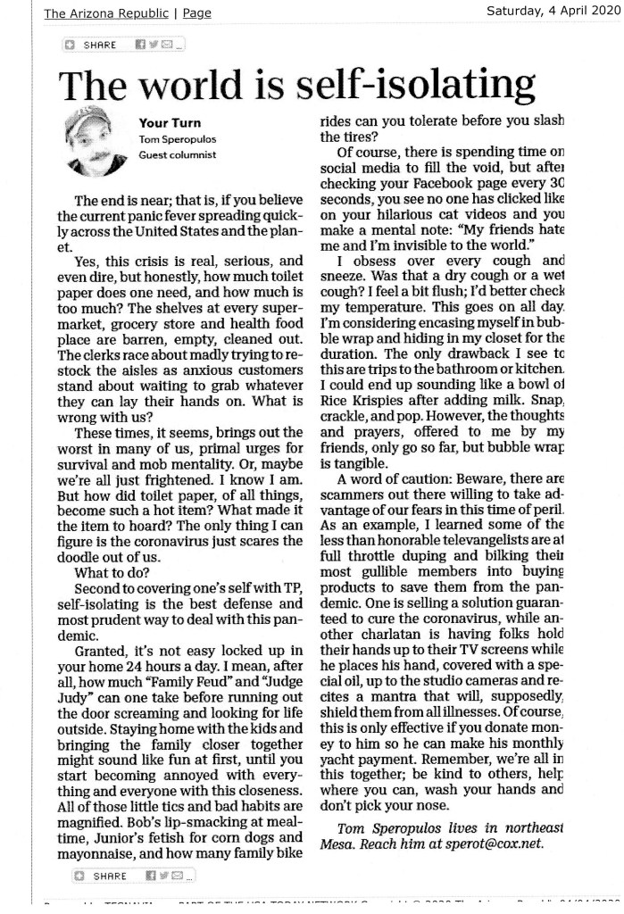 Are you ready for the Big One? No, not the California earthquake, or World War III; I mean the really big one, the *Zombie Apocalypse, that big one. With the turmoil in the world these days, Ukraine, the Middle East, and crazy politicians, I reason things could go south in a hurry, and I want to be ready. “Be Prepared,” is the Boy Scouts’ motto, not that I ever was one, but I consider it a good idea. Granted, I’m not a hardened Armageddon believer, or a full-fledged prepper, with guns and ammo stashed in my desert fortress, buried under a giant saguaro cactus on the outskirts of Barstow, California, but I am hedging my bets, just in case. Thanks to the COVID-19 pandemic, I have enough food, water, and toilet paper (left over from my pandemic-buying binges) to meet the needs of a mid-sized city in Nebraska. So, with that in mind, I’m set. I have a pellet gun, too, just in case I run out of my year’s supply of top ramen and corn dogs. I figured I could hunt the wildfowl in my backyard with my pellet rifle. I have a variety of feathered friends who visit regularly. Although I’ve found that hummingbirds and finches are the most difficult to bag given their tiny frames. Granted they are bird brains, but still, they’re quick little buggers. Further, after hitting them, I should think there’s not much left but feathers, and a tiny beak. Too crunchy, their beaks, that is. Otherwise, get ready and “Be Prepared,” for the Big One. For a fact sheet on what to keep on hand for the Big One, send $19.95 to Uncle Frank, P.O. Box 666, Death Valley, California 92328.